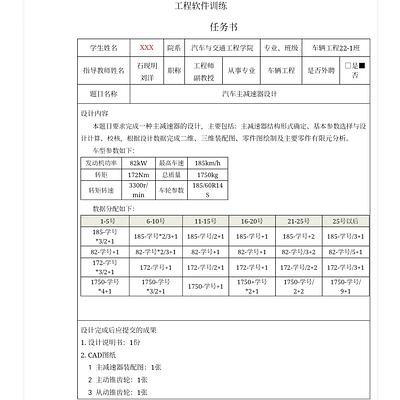 202500910-10-十字 说+装+2零件 万向节和传动轴 一组任务: 1、确定传动系方案及发动机主要性能指标。 2、确定传动系的传动比。 3、设计万向节和传动轴。 4、编制设计说明书。