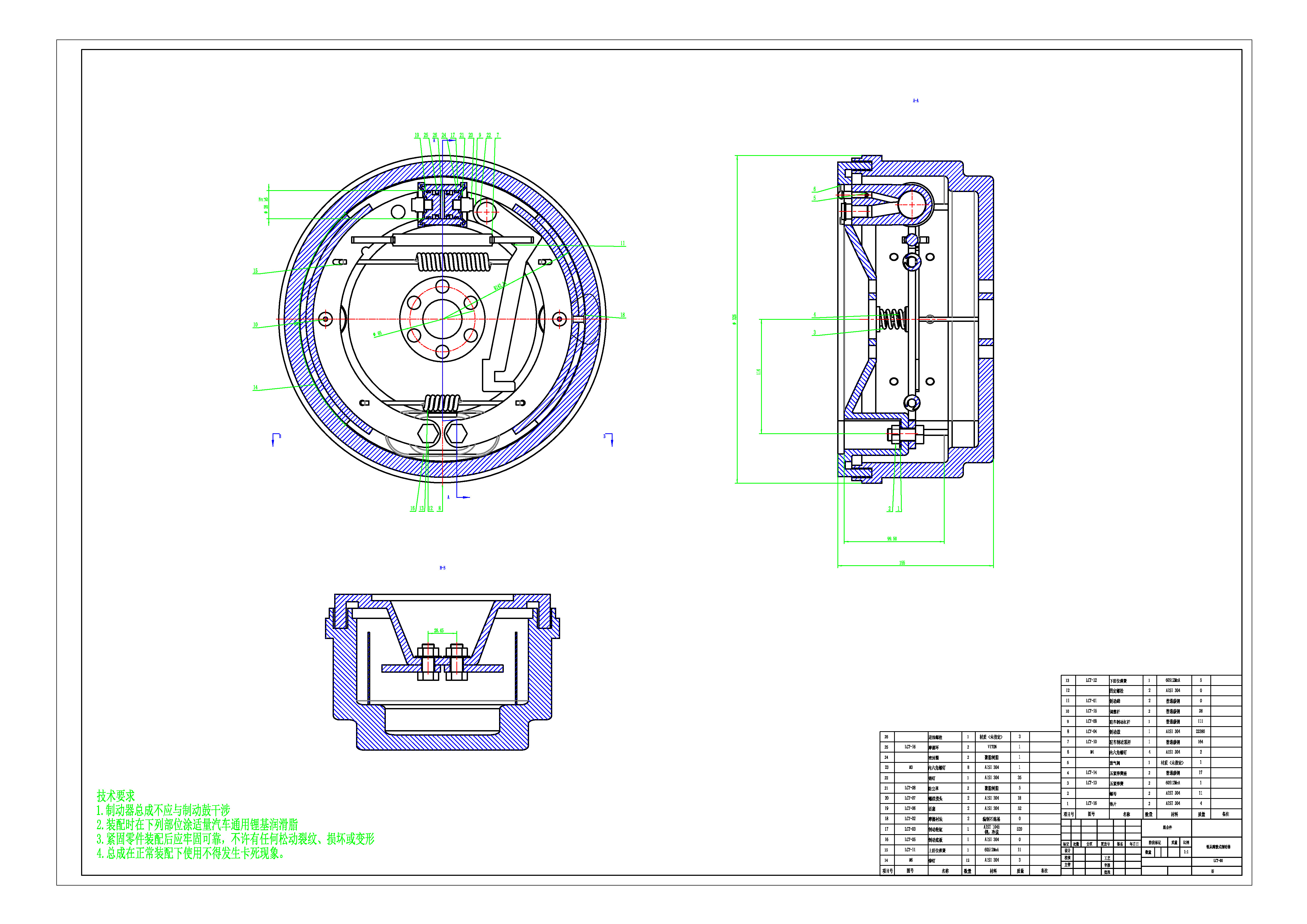 驱动形式:4×2(前置后驱);整车质量:1135kg(空载),2165kg(满载);质心高度:570mm(空载),550mm(满载);轴距:3060mm;最高车速:103km/h;轮胎:175R14LT-8PR;同步附着系数:0.75。制动鼓直径:284.48mm 制动蹄:摩擦衬片宽度b=72 包角β=95° β0=42.5° a=114 k=29 采用由定位销定位的一个自由度的非平衡式的领从蹄式制动器。 能用啥数据用啥 装配图 A0 零件(制动蹄)A3